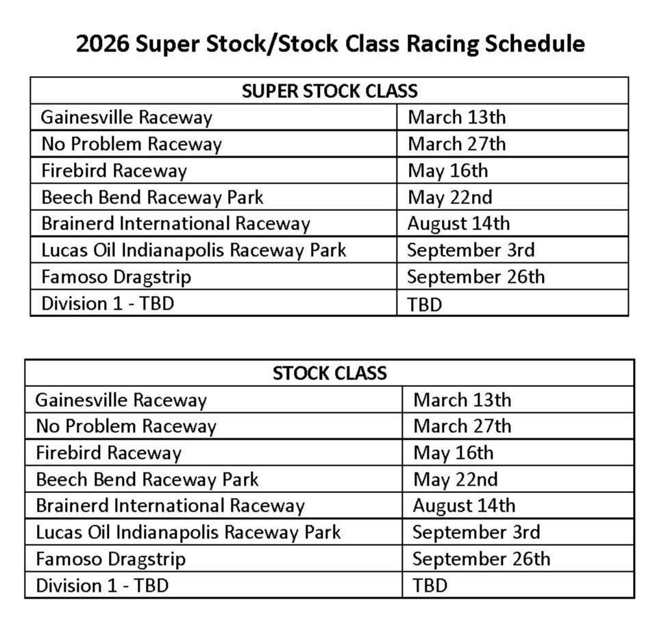 The Super Stock/Stock Class Racing schedule will include races at Gainesville Raceway on March 13, No Problem Raceway on March 27, Firebird Raceway on May 16, Beech Bend Raceway Park on May 22, Brainerd International Raceway on Aug. 14, Indianapolis, Famoso Dragstrip on Sept. 26 and Maple Grove Raceway on Oct. 23.